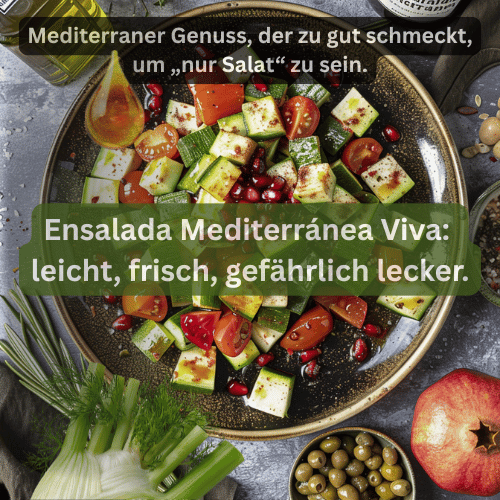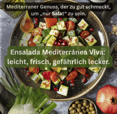 Ensalada Mediterránea Viva – Edición SanaFood. Dieser Salat lügt. Er tut so leicht – schmeckt aber wie ein mediterraner Höhenflug. Samfaina, Salicornia, Alcaparrones, Queso Majorero: ein Aromenfeuerwerk, das dich gesund macht, obwohl du nur genießen willst. SanaFood: Wenn „leicht essen“ plötzlich Spaß macht.